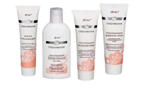 Whitening — если упаковка средства содержит данное слово, это отбеливающая косметика для лица, главная задача которой — разрушить гнездо меланоцитов и остановить производство ими красящего вещества. Она представлена многочисленными гелями, кремами от пигментных пятен, эмульсиями, сыворотками и т. д. Так что если приобрести всю линейку подобной продукции, это будет серьёзный удар по пигментации.