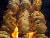 После того как весь шампур наполнен, картофель надрезается почти до самого шампура, через каждые 4-5 мм (или можно сразу нанизывать кружочки сырого картофеля, но с половинками – сочнее)