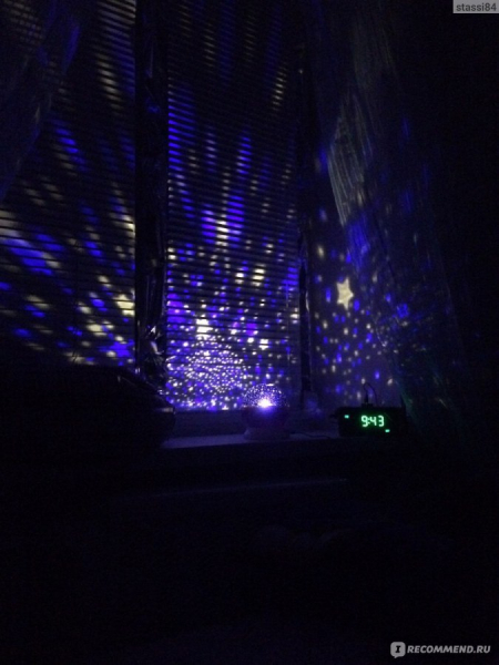 Первое испытание я провел на полке шкафа. проектор стоял у стены, а сверху была другая полка. При таких обстоятельствах действительно получилась интересная картинка. Правда, на настоящее звездное небо она была совершено не похожа, но как ночник смотрелась очень даже ничего: