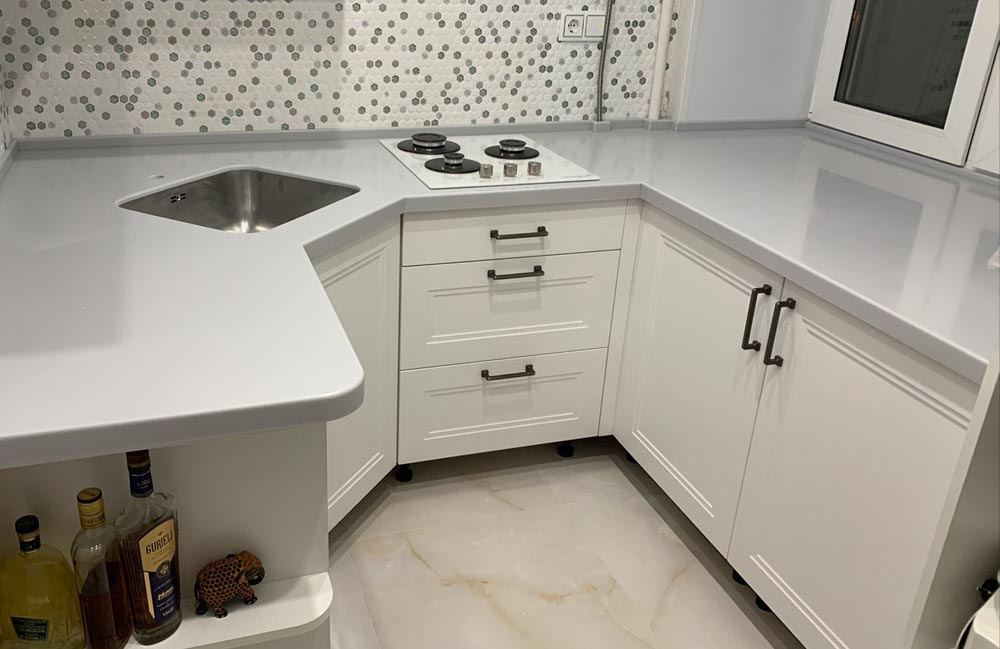 Белый цвет столешниц подходит для любого стиля и гармонично выглядит как в классическом, так и в современном дизайне. Из этого же материала можно оформить фартук над рабочим кухонным столом, подоконники, дверцы шкафов и туалетные столики в ванной комнате.