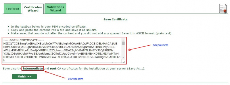 На завершающем этапе получаем сформированный сертификат. Копируем его к себе и сохраняем, попутно скачиваем корневой сертификат, он нам позже пригодится.