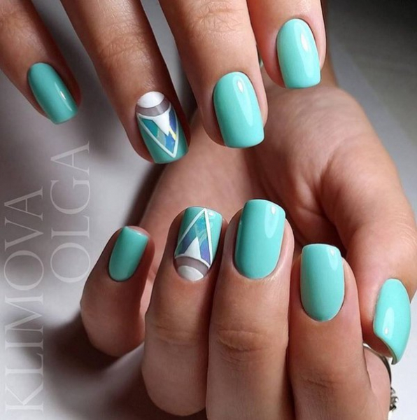 Бирюзовый маникюр с контрастными оттенками и стильной геометрией можно увидеть на фото.