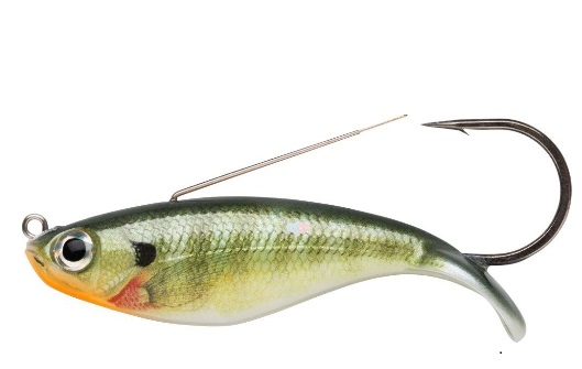 Приманка напоминает маленького окуня с чёрными вертикальными полосами на зеленоватом фоне.
