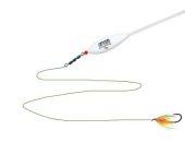 После того, как бомбарда установлена, нужно привязать поводок. Отрезаем кусок поводковой лески (около 1,8 м) и привязываем к вертлюжку каким-нибудь узлом, можно даже классической «удавкой». Затем надеваем на леску светонакопительную бусинку и привязываем крючок. В принципе оснастка готова.