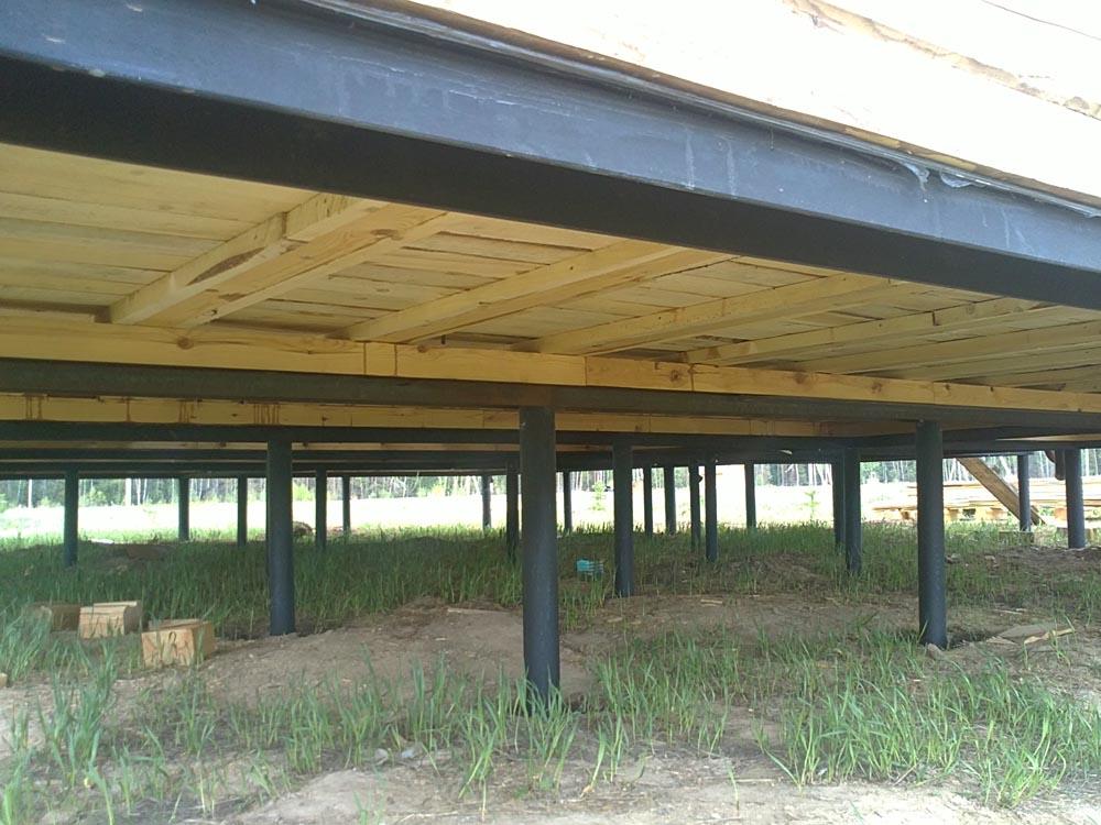 Основание для строения представляет собой несколько вкрученных в грунт полых изделий с лопастями. После выставления уровня трубы заполняются бетоном, и к ним привариваются оголовки. В единую конструкцию опоры соединяются с помощью ростверка. Изготавливают его из стальных балок, железобетона или деревянного бруса. Облицовочные панели крепятся к столбам и обвязке (выводить ее на внешние стены не рекомендуется, чтобы не нарушать их геометрию).