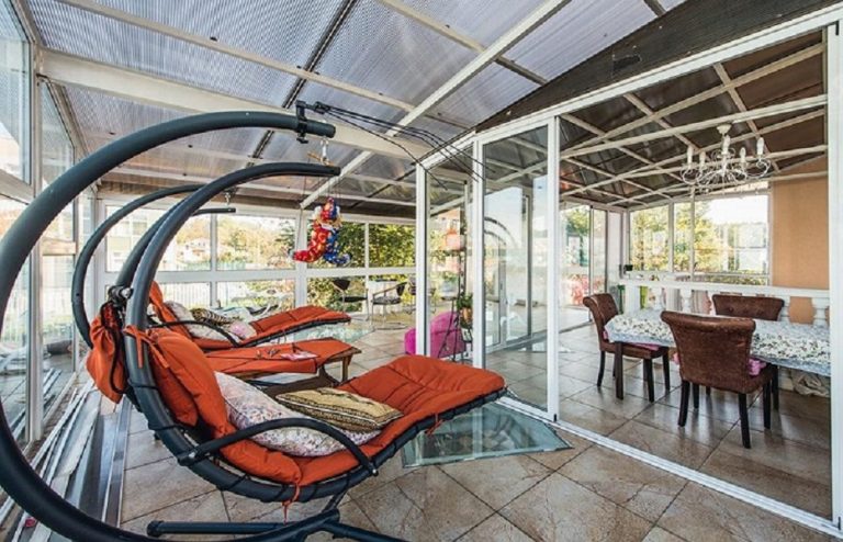 - На первом этаже коттеджа расположились столовая, подсобное помещение, тренировочный зал, большая гостиная и застекленная веранда.