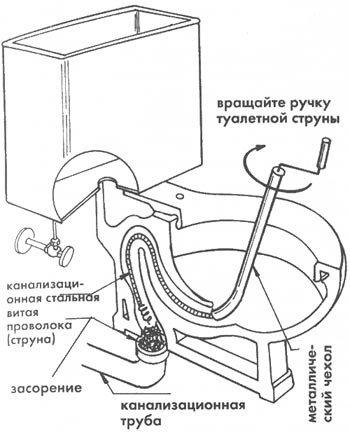При наличии троса его помещают в сливное отверстие унитаза и, непрерывно вращая его в одном направлении, начинают постепенно проталкивать внутрь. Если засор образовался именно в трубе унитаза, то через некоторое время трос упрётся в препятствие. В этом случае необходимо попытаться при помощи активных возвратно-поступательных движений протолкнуть засор или же извлечь его наружу. Если в первого раза не удалось достичь требуемого результата, процедуру надо повторить. В ходе подобной работы важно следить, чтобы трос находился в натянутом состоянии. Если он начнёт скручиваться внутри трубы, продолжение прочистки будет невозможно. К тому же это может повредить внутренние стенки трубы.