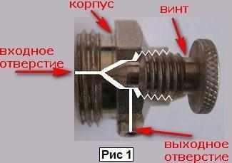 В простейшем варианте конструкция крана состоит из корпуса, в котором выполнено седло клапана, и винта конической формы. За счет того, что при вкручивании винта в корпус его конус максимально плотно прилегает к седлу, обеспечивается герметичность клапана, а для стравливания воздуха существует отверстие в корпусе, расположенное на его боковой грани.