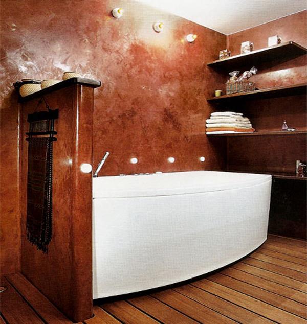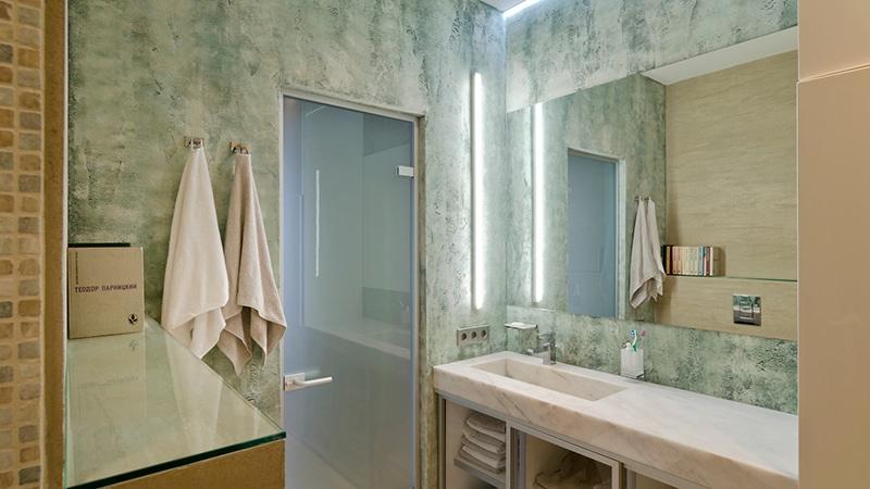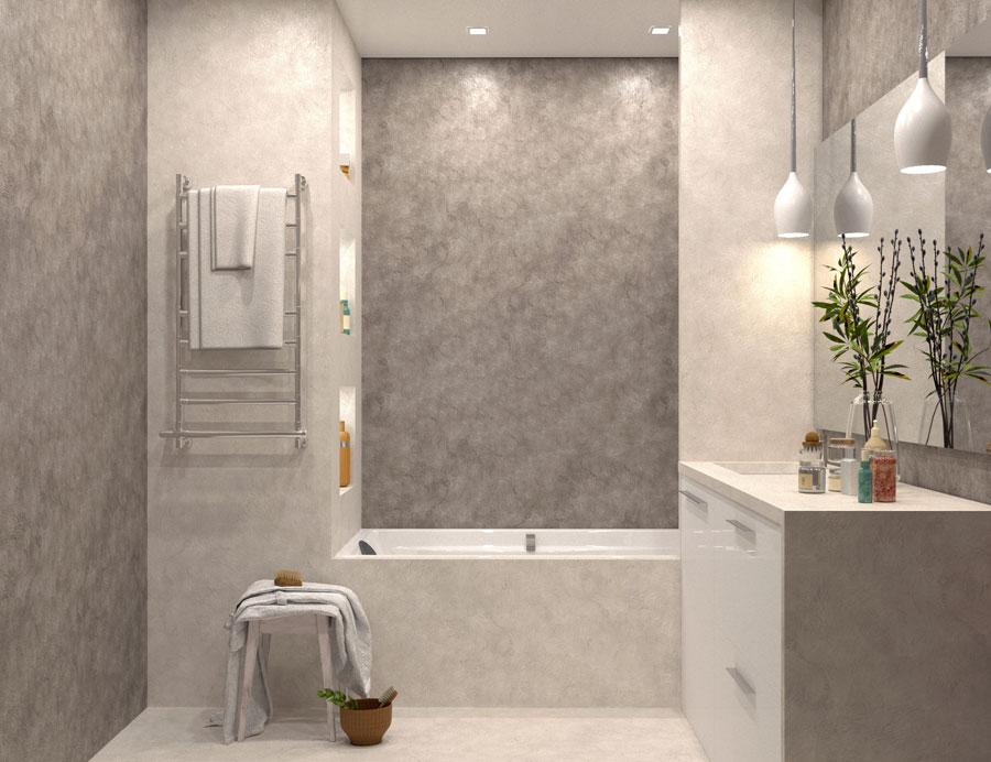 Ещё совсем недавно декоративная штукатурка как способ отделки ванной комнаты казалась чем-то невообразимым. Но сегодня, благодаря водостойкости этого материала, стены ванной можно превращать в невероятно красивые фактурные поверхности самых разных оттенков.