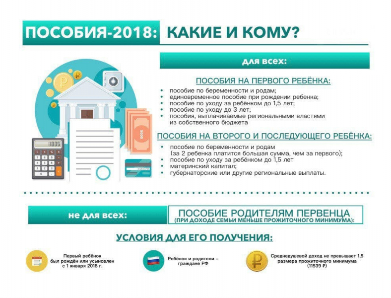 Название федерального пособия Размер пособия, руб. на федеральном уровне с 01.02.2018 г. в Александрово-Гайском районе области (+ 15%), руб. Единовременные По беременности и родам 9489 — минимум по МРОТ за каждый месяц декрета 10912,35 При постановке на учет в ранние сроки беременности 628,47 722,74 При рождении ребенка, его передаче на воспитание в семью 16759,09 19272,95 Беременной жене военнослужащего по призыву 26539,76 30520,72 Ежемесячные Пособие по уходу за ребенком до 1.5 лет 3142,33 — минимум на первого ребенка для безработных;3788,33 — минимум для работающих 4356,58 6284,65 — на второго и следующих детей 7227,35 Ежемесячная выплата при рождении 1 и 2 ребенка до 1.5 лет с 2018 года 9159,00 — в размере прожиточного минимума на ребенка На ребенка военнослужащего по призыву 11374,18 13080,31