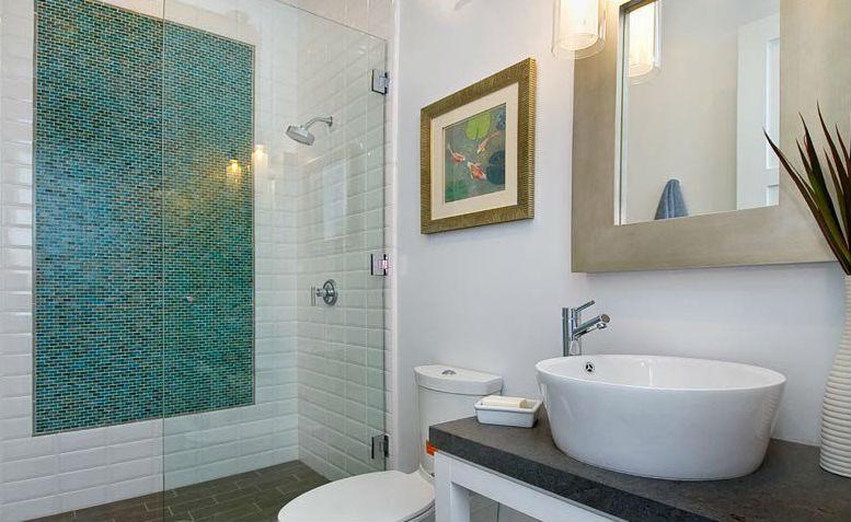 Главное правило, которое следует помнить при оформлении маленьких ванных комнат: акцент нужно делать на чём-то одном. Если оформление преимущественно однотонное, можно выделить одну стену или акцентировать внимание на потолке.