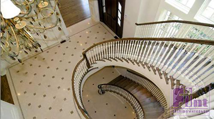 Комнаты на всех этажах объединяются просторным холлом. На первом этаже он наполнен светом, по полу уложена песочная глянцевая плитка. Отличительной характеристикой холла на втором этаже выступают колонны и камин, изготовленный из натурального камня.