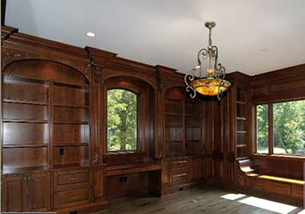Не обошлось и без личного кабинета хозяина дома. Все стены представляют собой встроенные книжные шкафы с полками различных размеров и конфигураций. Они выполнены из дерева ценных пород темного оттенка. Создают цельную композицию вместе с окнами, столом и уютной имитацией диванчика.