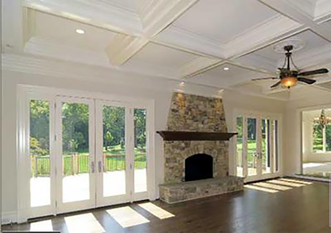 Гостиная также выполнена в белом цвете. Примечательно, что на потолке отсутствует привычная советскому человеку люстра. Освещение осуществляется посредством встроенных лампочек. Пол темный. Места настолько много, что можно устраивать светские балы. Главной достопримечательностью выступает камин, создающий атмосферу уюта.