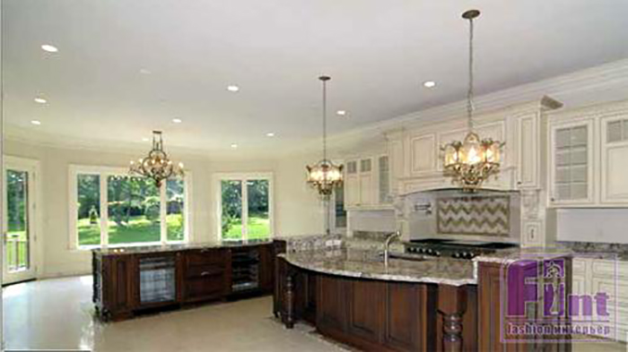 Кухня представляет собой комнату классического стиля. Она настолько больших размеров, что вмещает одновременно несколько гарнитуров одинаковой дизайнерской, цветовой стилизации. Фасады белые, форма П-образная. По центру нашли свое место два стола-островка, выполненные в более темных тонах. Чтобы разбавить общую картину, использовались золотые элементы фурнитуры, фигурки животных.