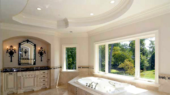 Ванная комната также впечатляет своим размахом. Примечательно наличие большого окна, установленного непосредственно над самой ванной, возвышающейся на пьедестале. Стены разделены визуально на две части. Верхний уровень – молочный, однотонный, нижний – отделан плиткой под мрамор песочного оттенка. Имеется ниша со встроенным комодом. Его литая поверхность из натурального камня имитирует столешницу, плавно перетекающую в раковину. На стене висят обрамленное в черный металлический каркас зеркало и выполненные из того же материала бра.