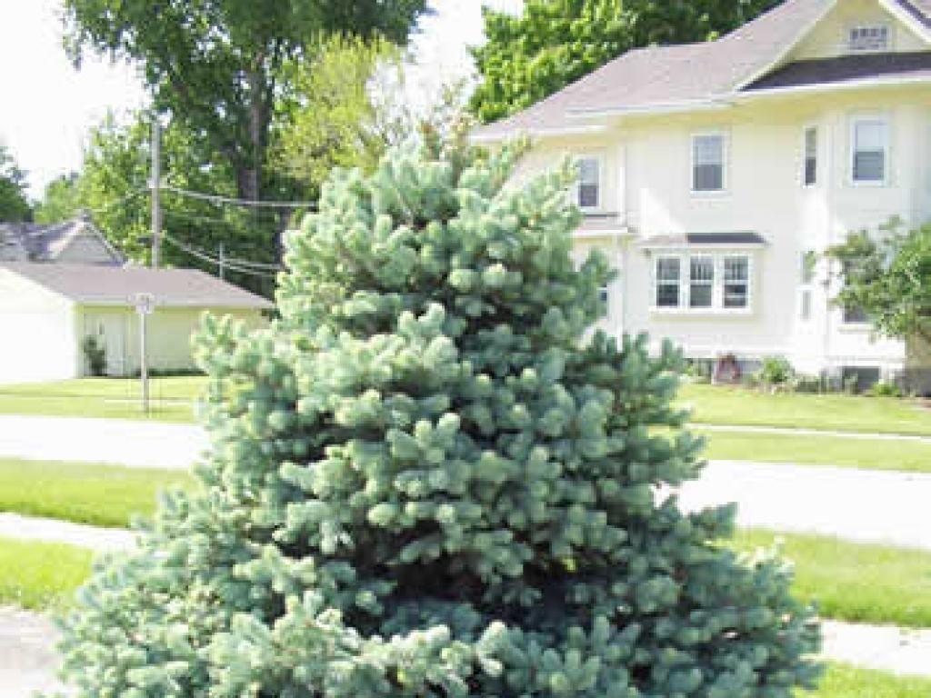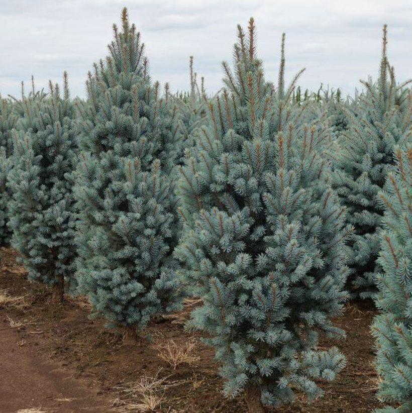 Так называется ель голубая, описание которой включает крону конической формы. Относится к высокорослым хвойным культурам. Высота ствола этого растения достигает 10 м. Скорость роста составляет 20 см в год. Крона образована мощными ветвями, расположенными под прямым углом. Длина иголок — 2-2,5 см. Хвоя имеет серо-синий цвет и отличается повышенной жесткостью. Если ель произрастает на хорошо освещенном участке, иголки приобретают ярко-голубой цвет.