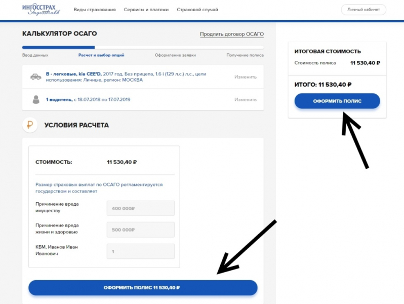 Сделайте расчет страховки и нажмите кнопку «Заказать полис»: