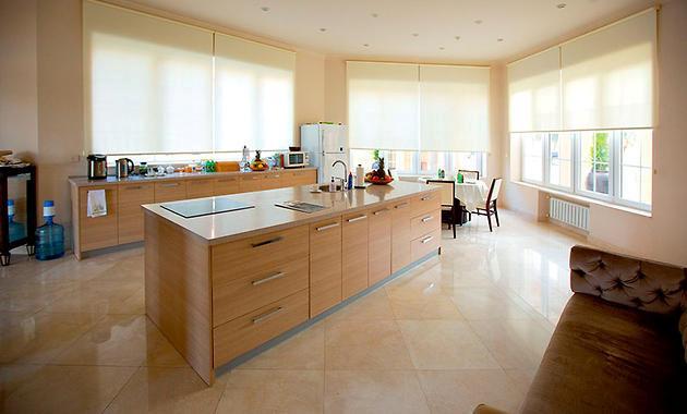 Светлые просторные комнаты лишены нагромождения мебели и кричащих цветов. Повсюду расставлены многочисленные диваны и кресла, постелены ковры. Помещения декорированы: