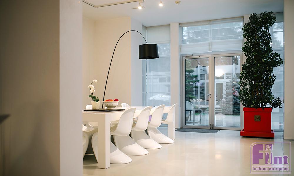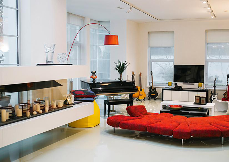 Главная гордость семьи — стеклянный газовый камин. По центру гостиной установлен белоснежный обеденный стол со стульями в стиле модерн.