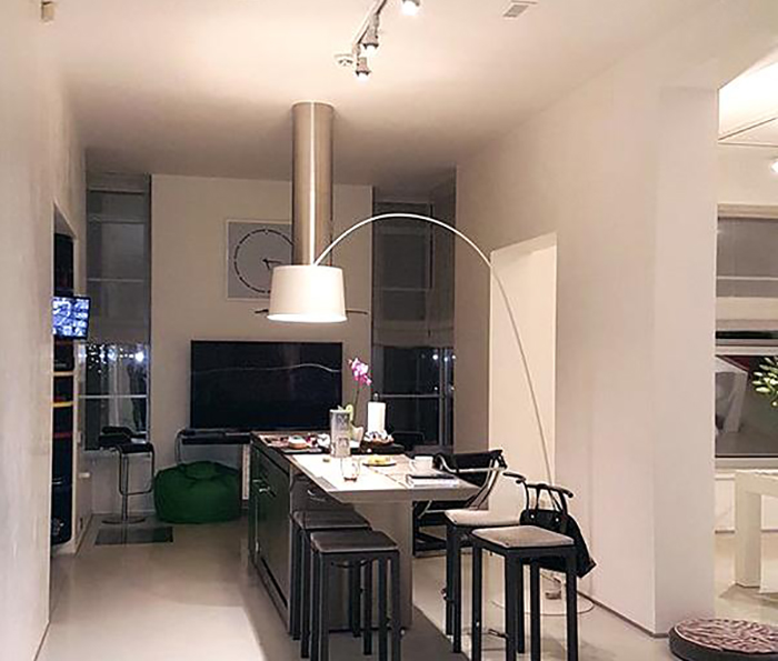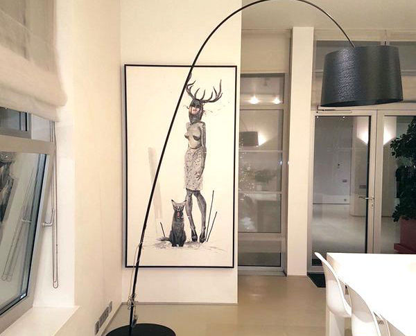 Колоритным акцентом современной кухни стал дизайнерский торшер на выгнутой ножке. Таких необычных авторских светильников разных оттенков в интерьере несколько.