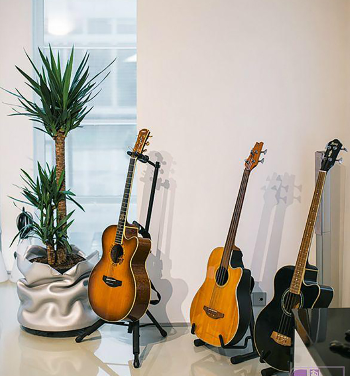 На первом уровне основной виллы разместились просторная гостиная-столовая, кухня, полноценная студия для репетиций.