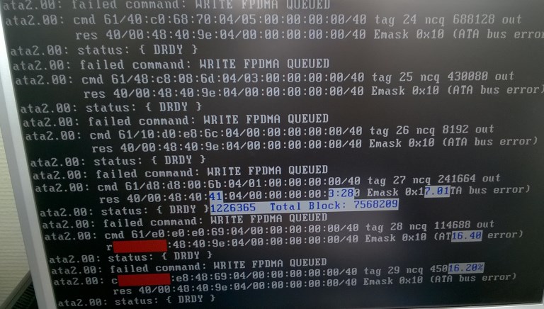 Mar 19 15:54:20 mbpc-pc kernel: blk_update_request: I/O error, dev sdd, sector 1001534264 Mar 19 15:54:20 mbpc-pc kernel: ata4: EH complete Mar 19 15:54:24 mbpc-pc kernel: ata4.00: exception Emask 0x0 SAct 0x7fffffff SErr 0x0 action 0x0 Mar 19 15:54:24 mbpc-pc kernel: ata4.00: irq_stat 0x40000008 Mar 19 15:54:24 mbpc-pc kernel: ata4.00: failed command: READ FPDMA QUEUED Mar 19 15:54:24 mbpc-pc kernel: ata4.00: cmd 60/08:28:48:34:b2/00:00:3b:00:00/40 tag 5 ncq dma 4096 in Mar 19 15:54:24 mbpc-pc kernel: res 41/40:08:48:34:b2/00:00:3b:00:00/00 Emask 0x409 (media error) Mar 19 15:54:24 mbpc-pc kernel: ata4.00: status: { DRDY ERR } Mar 19 15:54:24 mbpc-pc kernel: ata4.00: error: { UNC } Mar 19 15:54:24 mbpc-pc kernel: ata4.00: configured for UDMA/133 Mar 19 15:54:24 mbpc-pc kernel: sd 7:0:0:0: [sdd] tag#5 FAILED Result: hostbyte=DID_OK driverbyte=DRIVER_SENSE Mar 19 15:54:24 mbpc-pc kernel: sd 7:0:0:0: [sdd] tag#5 Sense Key : Medium Error [current] Mar 19 15:54:24 mbpc-pc kernel: sd 7:0:0:0: [sdd] tag#5 Add. Sense: Unrecovered read error – auto reallocate failed Mar 19 15:54:24 mbpc-pc kernel: sd 7:0:0:0: [sdd] tag#5 CDB: Read(10) 28 00 3b b2 34 48 00 00 08 00 Mar 19 15:54:24 mbpc-pc kernel: blk_update_request: I/O error, dev sdd, sector 1001534536 Mar 19 15:54:24 mbpc-pc kernel: ata4: EH complete Mar 19 15:54:24 mbpc-pc kernel: qla2xxx [0000:04:00.0]-e872:20: qlt_24xx_atio_pkt_all_vps: qla_target(0): type d ox_id 0000 Mar 19 15:54:24 mbpc-pc kernel: qla2xxx [0000:04:00.0]-e82e:20: IMMED_NOTIFY ATIO Mar 19 15:54:24 mbpc-pc kernel: qla2xxx [0000:04:00.0]-f826:20: qla_target(0): Port ID: 0x00:00:01 ELS opcode: 0x03 Mar 19 15:54:24 mbpc-pc kernel: qla2xxx [0000:04:00.0]-e81c:20: Sending TERM ELS CTIO (ha=ffff88010ef90000) Mar 19 15:54:24 mbpc-pc kernel: qla2xxx [0000:04:00.0]-f897:20: Linking sess ffff8800c3f84b40 [0] wwn 50:01:43:80:16:77:99:38 with PLOGI ACK to wwn 50:01:43:80:16:77:99:38 s_id 01:00:00, ref=1 Mar 19 15:54:24 mbpc-pc kernel: qla2xxx [0000:04:00.0]-e862:20: qla_target(0): Unexpected NOTIFY_ACK received Mar 19 15:54:26 mbpc-pc kernel: INFO: task kworker/1:2:96 blocked for more than 120 seconds. Mar 19 15:54:26 mbpc-pc kernel: Not tainted 4.8.4 #2 Mar 19 15:54:26 mbpc-pc kernel: “echo 0 > /proc/sys/kernel/hung_task_timeout_secs” disables this message. Mar 19 15:54:26 mbpc-pc kernel: kworker/1:2 D ffff8801115db718 0 96 2 0x0000000 Mar 19 15:54:26 mbpc-pc kernel: kworker/1:2 D ffff8801115db718 0 96 2 0x00000000 Mar 19 15:54:26 mbpc-pc kernel: Workqueue: qla_tgt_wq qlt_do_work [qla2xxx] Mar 19 15:54:26 mbpc-pc kernel: ffff8801115db718 ffff8801115db688 ffff88011a83a300 ffff88011fc17a80 Mar 19 15:54:26 mbpc-pc kernel: ffff8801115d20c0 ffff880100000001 ffffffff8109075d 0000000000000000 Mar 19 15:54:26 mbpc-pc kernel: ffff88011ffdc5c0 ffff880100000000 0000000000000011 ffff880100000000 Mar 19 15:54:26 mbpc-pc kernel: Call Trace: