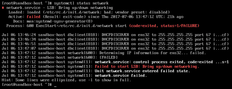 ? network.service – LSB: Bring up/down networking Loaded: loaded (/etc/rc.d/init.d/network) Active: failed (Result: exit-code) Docs: man:systemd-sysv-generator(8) Process: 1962 ExecStart=/etc/rc.d/init.d/network start (code=exited, status=1/FAILURE) CGroup: /system.slice/network.service +-2731 /sbin/dhclient -H localhost -1 -q -lf /var/lib/dhclient/dhclient-3cc8dfc3-a3e8-483… localhost.localdomain dhclient[2976]: No DHCPOFFERS received. localhost.localdomain network[1962]: Determining IP information for enp130s0f0… …d. localhost.localdomain network[1962]: [FAILED] localhost.localdomain network[1962]: Bringing up interface enp130s0f1: localhost.localdomain network[1962]: Determining IP information for enp130s0f1… …e? localhost.localdomain network[1962]: [FAILED] localhost.localdomain systemd[1]: network.service: Control process exited, code=e…s=1 localhost.localdomain systemd[1]: Failed to start LSB: Bring up/down networking. localhost.localdomain systemd[1]: network.service: Unit entered failed state. localhost.localdomain systemd[1]: network.service: Failed with result 'exit-code'.