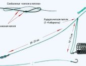 Основная леска пропускается сквозь полый центральный стержень, и кормушка свободно скользит по ней от поводочного вертлюжка до стопорной дробинки. Однако особенность такого монтажа одновременно является и недостатком из-за частичной потери чувствительности снасти.