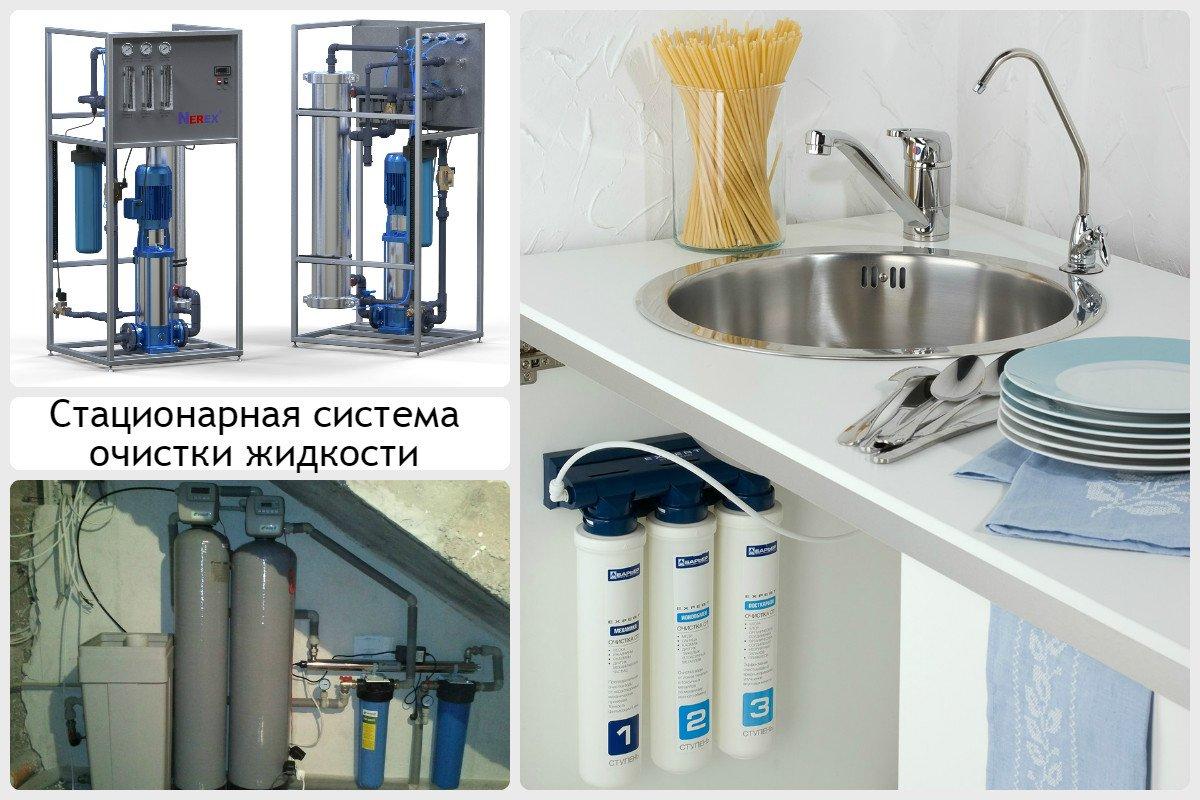 Стационарная система является одной из самых эффективных вариантов очистки. Она устанавливается в закрытое место, исключая при этом, все возможные перемещения. Данная конструкция присоединяется напрямую к системе водопровода. Пройдя через фильтрационную систему, жидкость будет поступать через специально отведенный кран. Стационарные системы выпускаются трех видов, в зависимости от качества фильтрации: одной, двумя и тремя ступенями очистки воды.