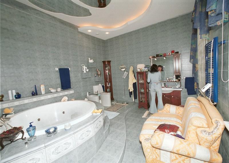 Потолок оригинальной формы выполнен с подсветкой и в белом цвете. Для отдыха у одной из стен поставлен диван в бело-песочную полоску. Другой санузел выполнен в теплых кирпичных тонах. Большую часть пространства здесь занимает ванна, напротив — небольшой умывальник и зеркало.