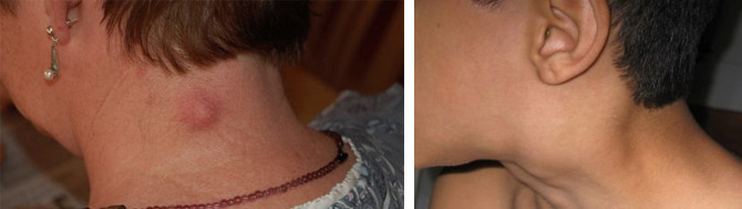 Для того чтобы отличить жировой узел от воспаленного лимфоузла, следует обратить внимание на общую симптоматику, а также иметь представление о том, как выглядит жировик на шее. В отличие от лимфаденита, липома не причиняет дискомфорта, не сопровождается головной болью, повышенной температурой и болезненностью самой опухоли.