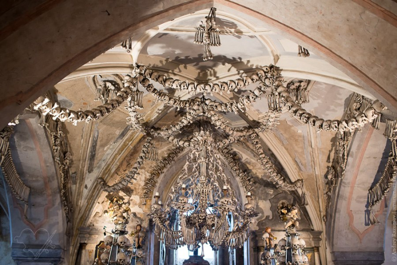 Один из самых известных храмов находится в городке Кутна Гора, расположенном в часе езды от чешской столицы. Он состоит из 40 000 человеческих останков. Это население небольшого городка! В нем из костей изготовлено абсолютно все: светильники, алтарная часть, черепами обложены стены, разве что на полу не выложены останки.