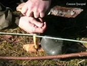 Снизу, под углублением, вырежьте полость для трута. Стержню, который придется вращать, придайте цилиндрическую форму. Из гибкой ветки и сыромятного ремешка, бечевки или шнурка от обуви сделайте лук.