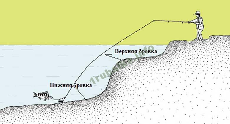 Участок, на котором терраса (стол, полив) переходит в свал, называется «верхняя бровка». Постепенно спуск на бровке становиться более пологим и плавным или вообще почти ровным – это «нижняя бровка», именно этот участок нужно искать рыболову и на нем ловить.