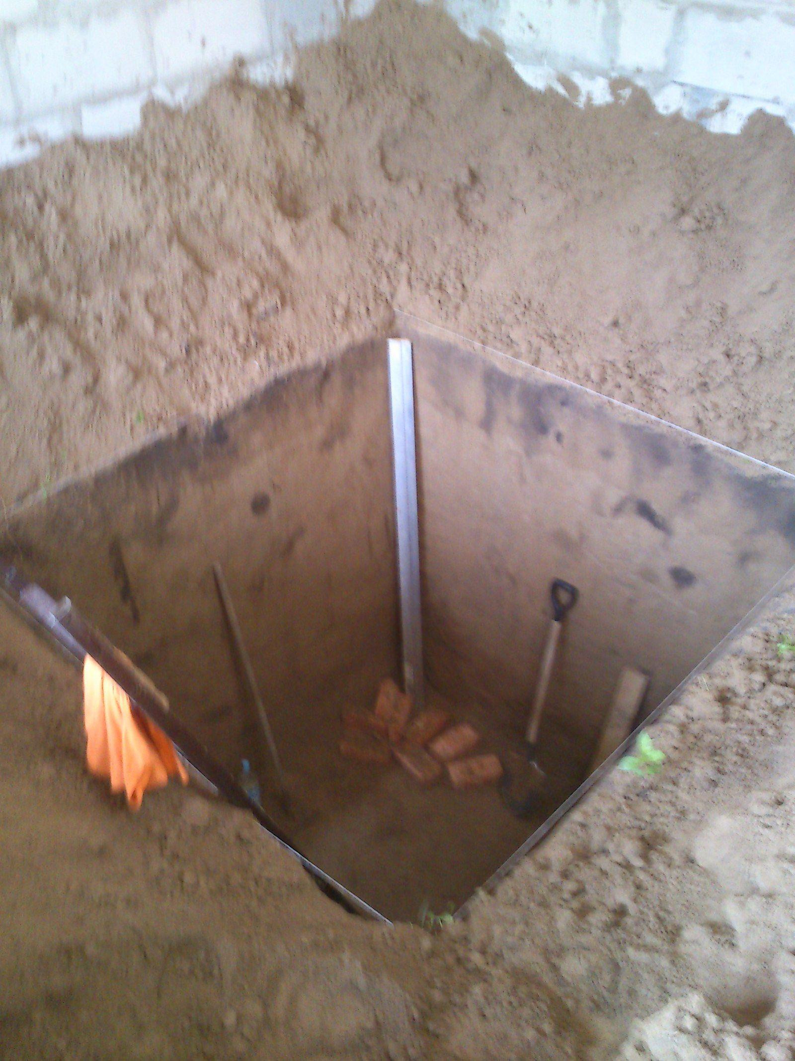 Для защиты погреба от сырости со стен котлована в сырых местностях устраивают бетонные стены с гидроизоляцией. Это нужно учесть при копке котлована и сделать его немного шире, чем требуемые размеры подвала. При формировании плиты в жидком бетоне закрепляют вертикальную арматуру по периметру стен. После заливки стяжки пола и ее просыхания в течение 10-15 суток начинают возведение стен из бетона: