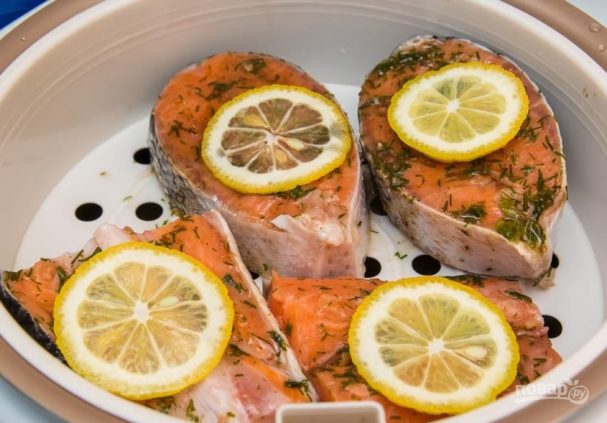 Перед приготовлением на пару рыбу можно полить соком лимона или смазать сметаной.