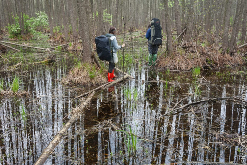 Все вещи, которые могут отсыреть упаковывают в пакеты. Лямки рюкзака ослабляют, в случае необходимости его нужно суметь быстро снять. В идеале нужно иметь с собой в походе специальные болотоходы.