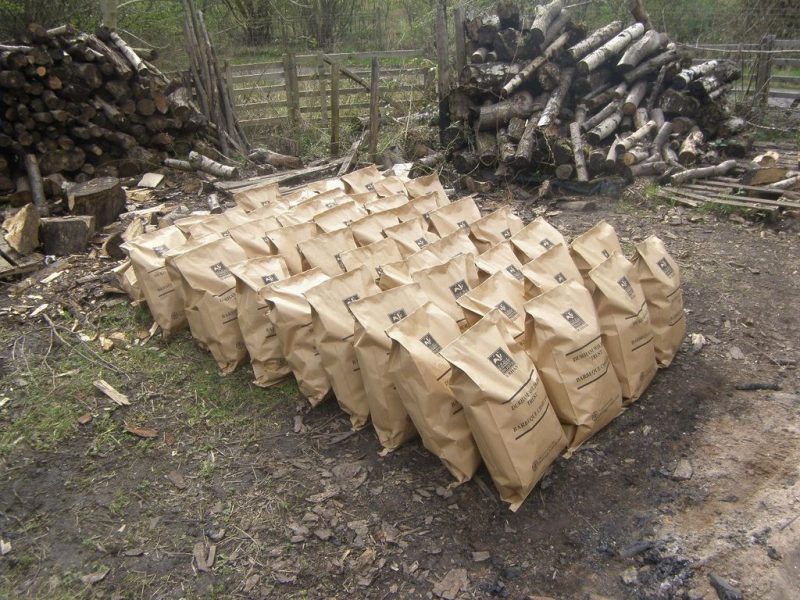 Как только ветки начинают дружно гореть, постепенно закладываем сверху поленья. Поленья необходимо очистить от коры, так как кора выделяет много дыма. Чем мельче и суше поленья, тем меньше времени займёт заготовка угля.