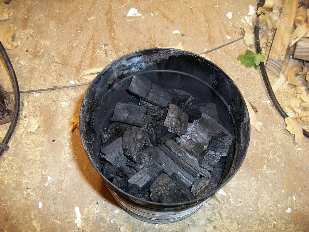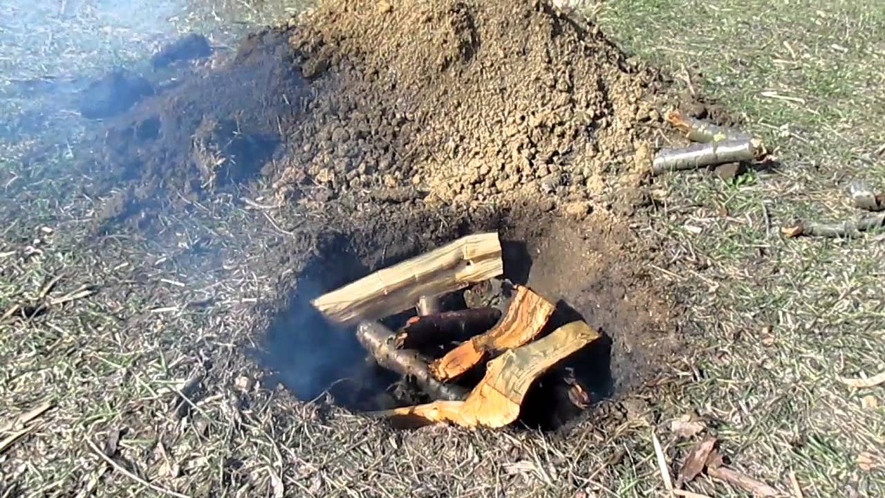Выкапывается яма цилиндрической формы глубиной примерно 80 см и диаметром 50 см. Дно тщательно утрамбовывается, чтобы земля не попала в готовый продукт выжигания. Стенки ямы должны быть строго вертикальны. Сухой хворост укладывается на дно ямы и поджигается.
