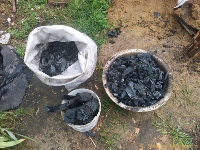Полученный уголь просеиваем, чтобы отделить от мелких частиц и складываем в мешки. Хранить уголь необходимо в сухом месте. С полной ямы размером 80*50 получается два мешка готового древесного топлива.