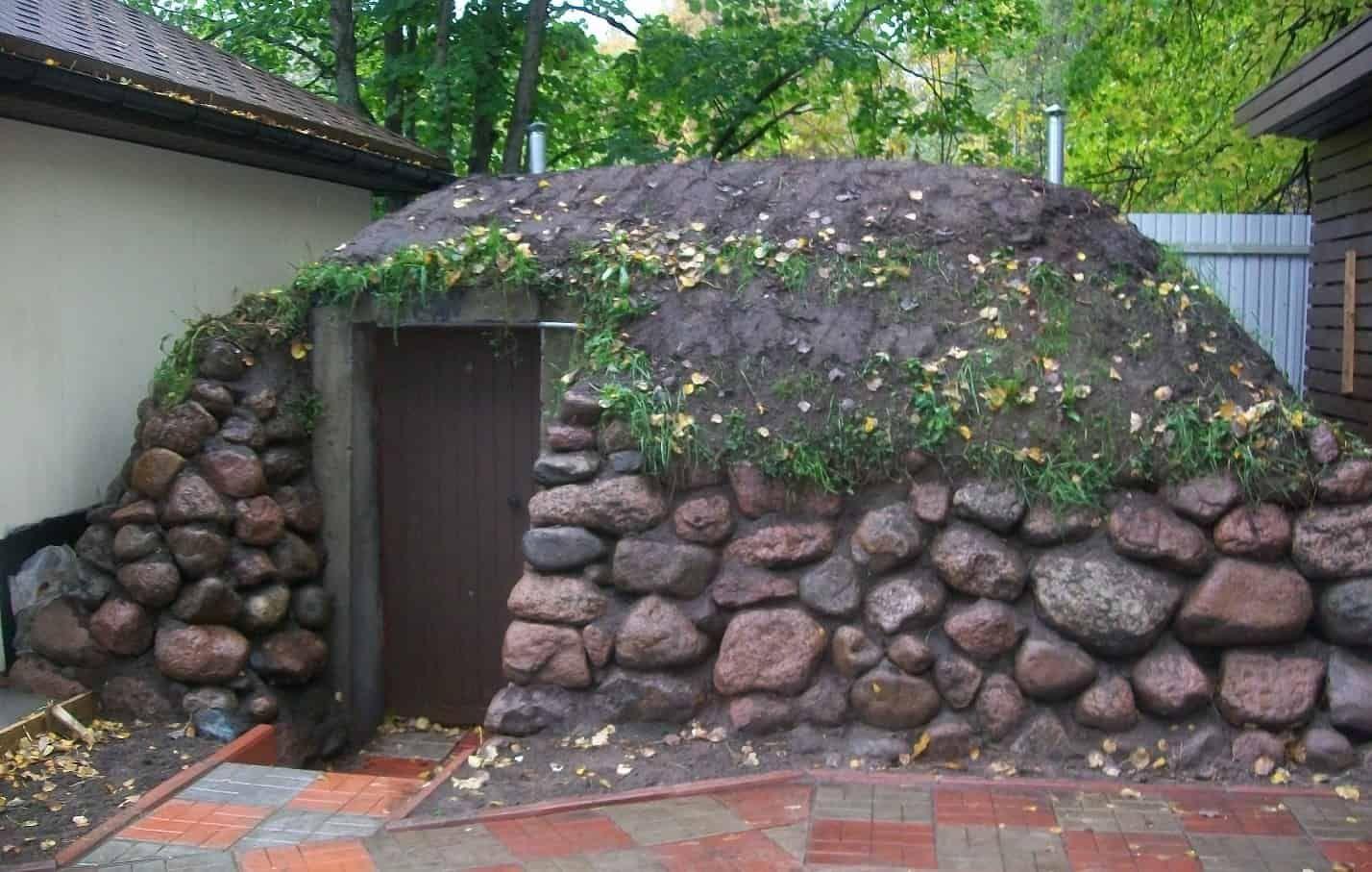 Конструкцию можно замаскировать под альпийскую горку или сделать большую декоративную клумбу. Стены погреба можно выложить камнем.