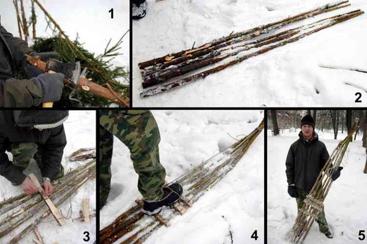 2 способ более надежен и уверенней держит на снегу, чтобы его сделать нам потребуются те же инструменты и 4-5 стволов не толстых молодых елочек.
