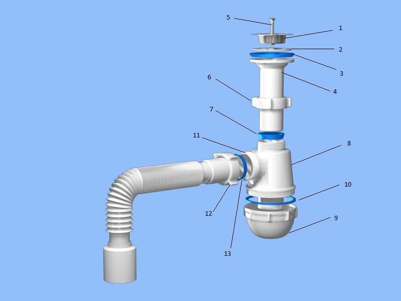 Как собрать сифон своими руками? В целом, принцип работы сифонов одинаков, а их устройство – схоже. Ниже вы найдете список составных элементов конструкции.