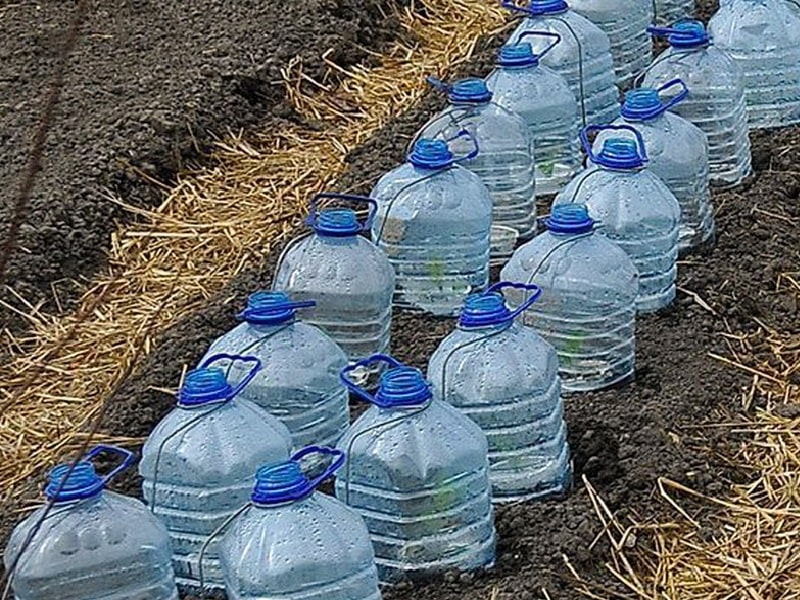 Грядку из бутылки переносят в теплое место, располагают ее на поддоне, тогда жидкость не будет выливаться. Когда осуществляется полив, открывать грядку не нужно. Вода будет попадать внутрь через отверстия. Если дырки отличаются небольшим размером, жидкость не сможет проникнуть внутрь при поливе. По этой причине еще на этапе, когда выполняется перфорация, следует делать отверстия большего диаметра.