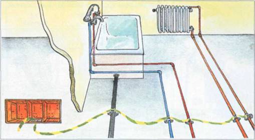 - Обеспечить в ванном помещении соединение всех деталей из металла проводником.