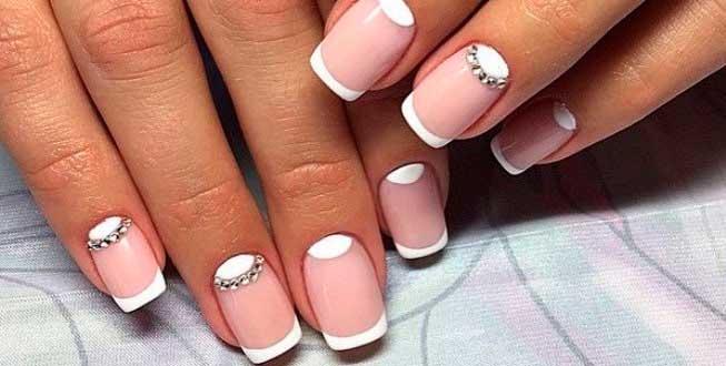 Классический французский маникюр. Ногтевая пластина имеет натуральный цвет (розовый, бежевый), кончик ногтя окрашивается в белый цвет и имеет форму, повторяющую естественную «улыбку» ногтя по линии отделения ногтевой пластины от ногтевого ложа.