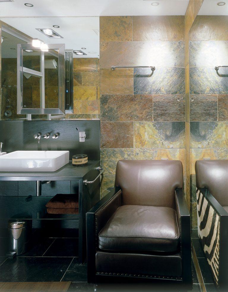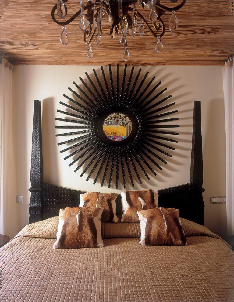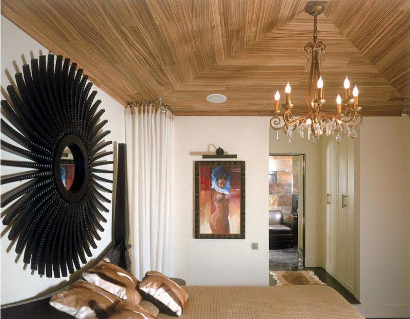 Над дизайном жилплощади работали профессионалы, но хозяин жилья тоже не остался в стороне. По всему периметру прослеживаются африканские мотивы. Этому способствуют высокие потолки, обитые деревом.