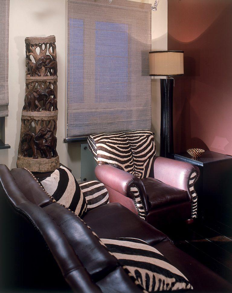 Обивкой мягкой мебели служат шкуры зебры. Осветительные приборы напоминают подсвечники из дерева с зажженными в них свечами. На стенах с простой, белой отделкой много ярких африканских картин.