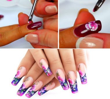 Нейл-дизайн выполняют в технике разных цветовых переходов – вначале создают эскиз рисунка, который затем дополняют разными мелкими деталями. Всю работу следует выполнять очень плавно: переходы от одного тона к другому должны быть почти незаметны.